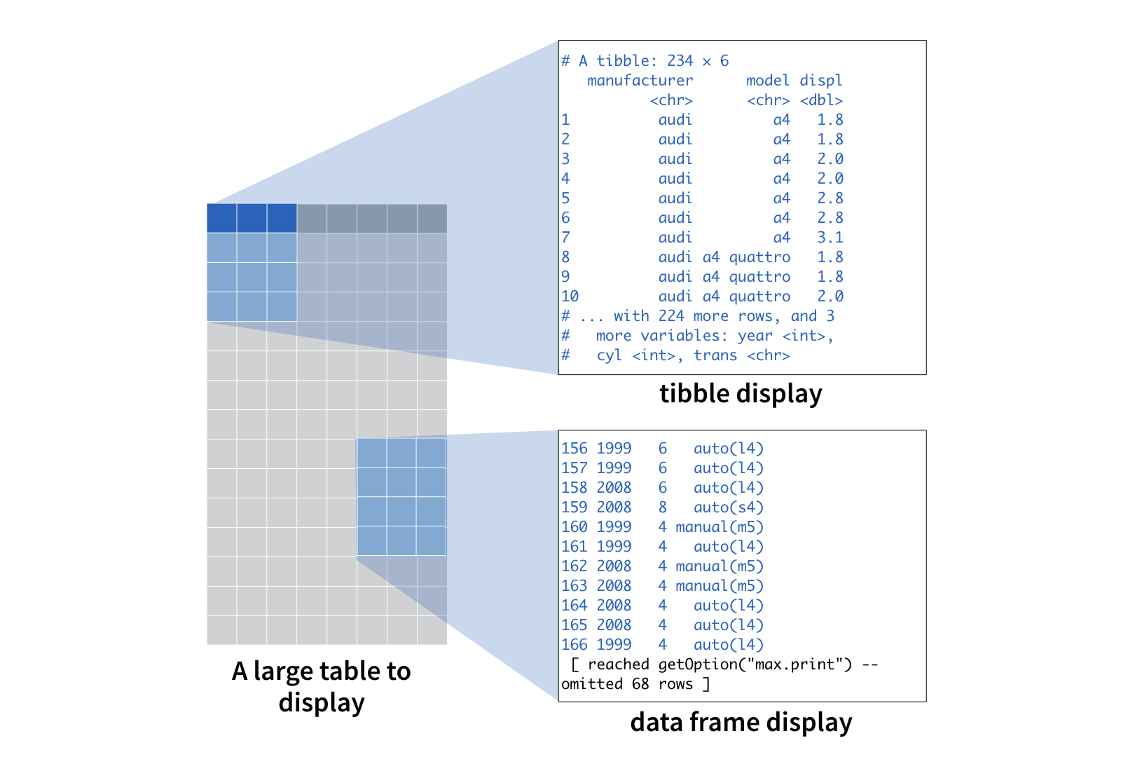 You can think of the difference between the data frame display and the tibble display like this: