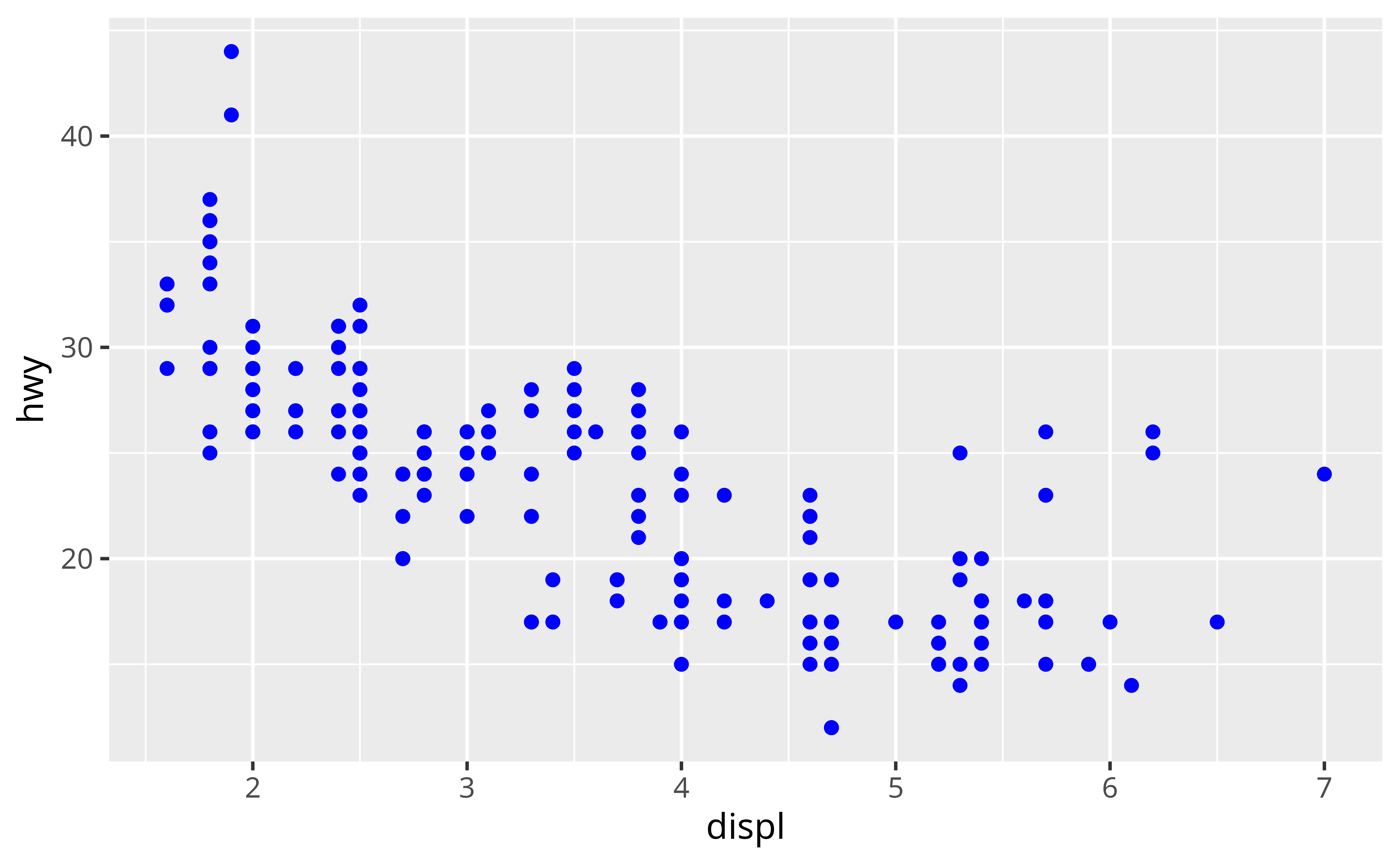 geom_point(mapping = aes(x = displ, y = hwy), color = "blue")Good job! Putting an aesthetic in the wrong location is one of the most common graphing errors. Sometimes it helps to think of legends. If you will need a legend to understand what the color/shape/etc. means, then you should probably put the aesthetic inside aes() — ggplot2 will build a legend for every aesthetic mapped here. If the aesthetic has no meaning and is just… well, aesthetic, then set it outside of aes().”