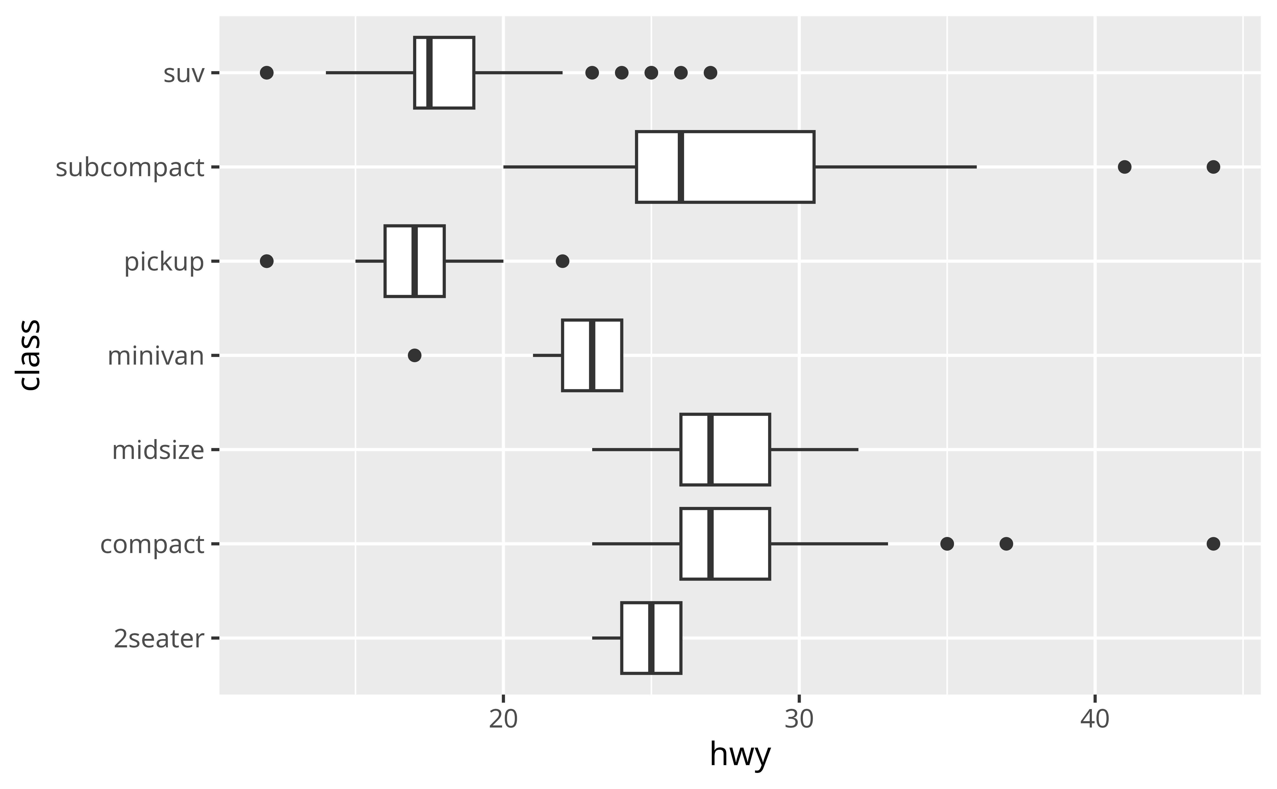 geom_boxplot(mapping = aes(x = hwy, y = class))