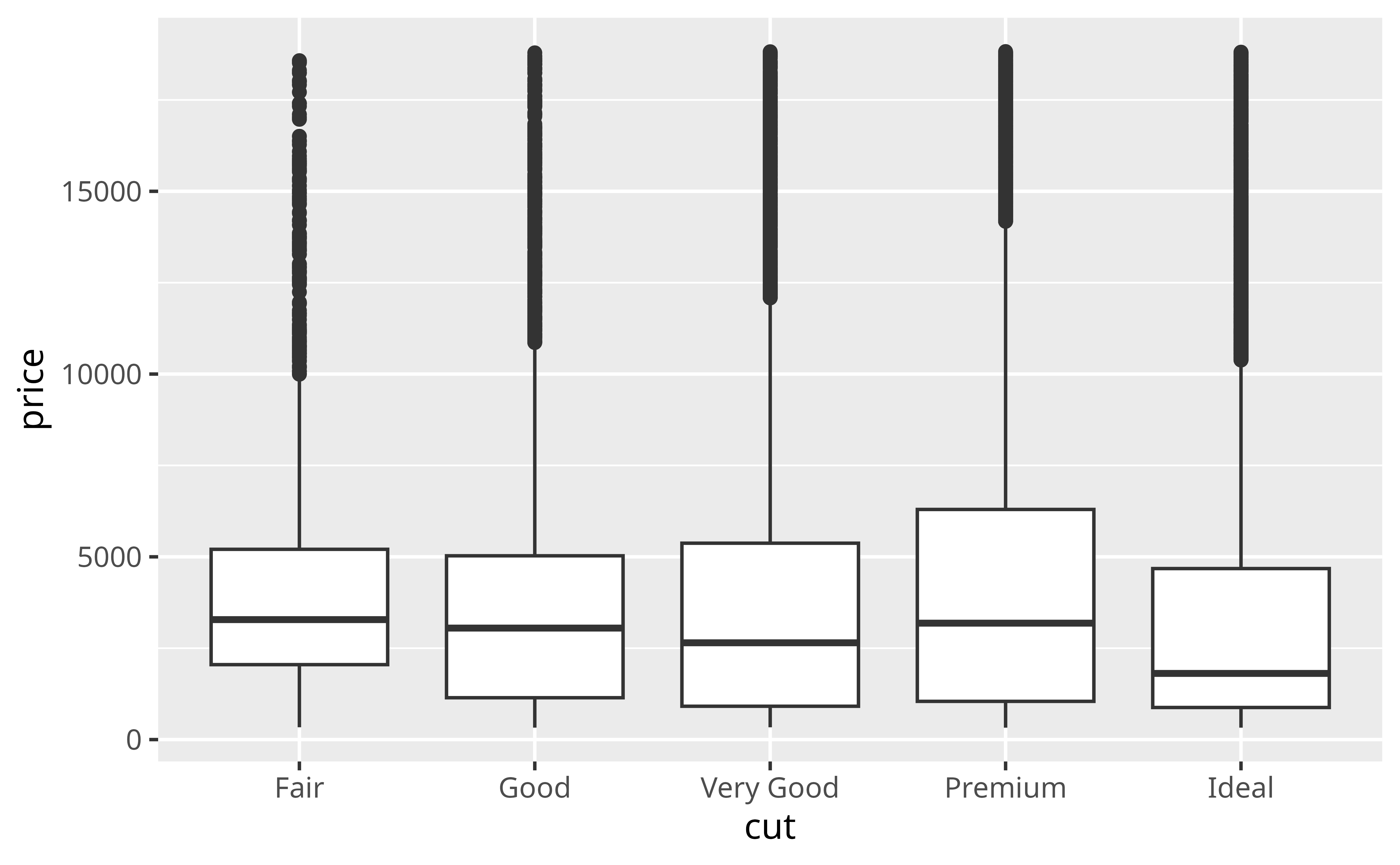 geom_boxplot(mapping = aes(x = cut, y = price))Do you notice how many outliers appear in the plot? The boxplot algorithm can identify many outliers if your data is big, perhaps too many. Let’s look at ways to suppress the appearance of outliers in your plot.