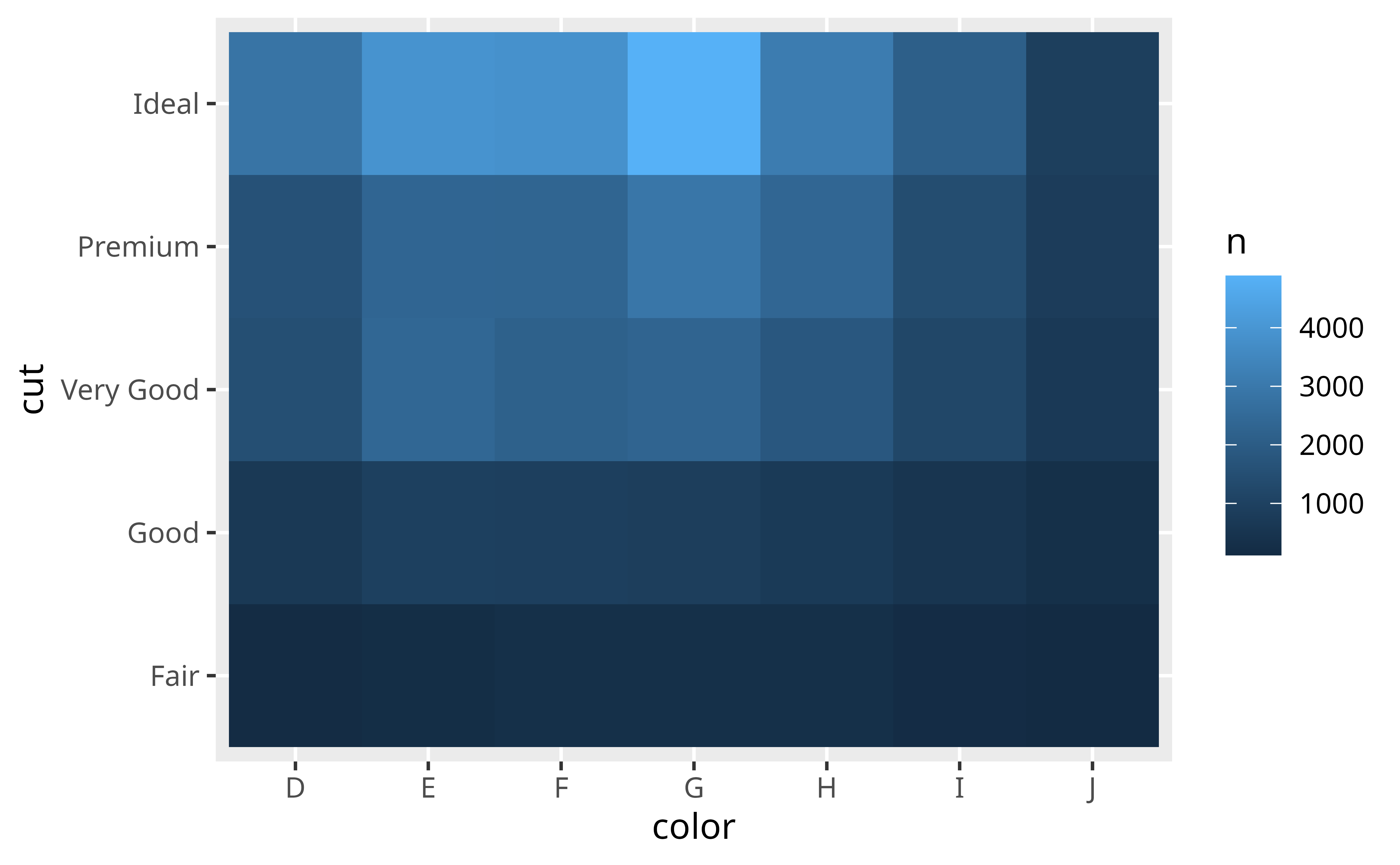 To do this, set the x and y aesthetics of geom_tile() to the variables that you pass to count(). Then map the fill aesthetic to the n variable computed by count(). The plot below displays the same counts as the plot in Exercise 8.