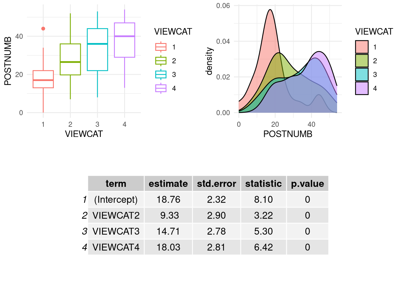 If we compare the box plot, kernel density plot, and model output below, the relationships between the regression coefficient estimates for the viewing categories and the group means should be evident.