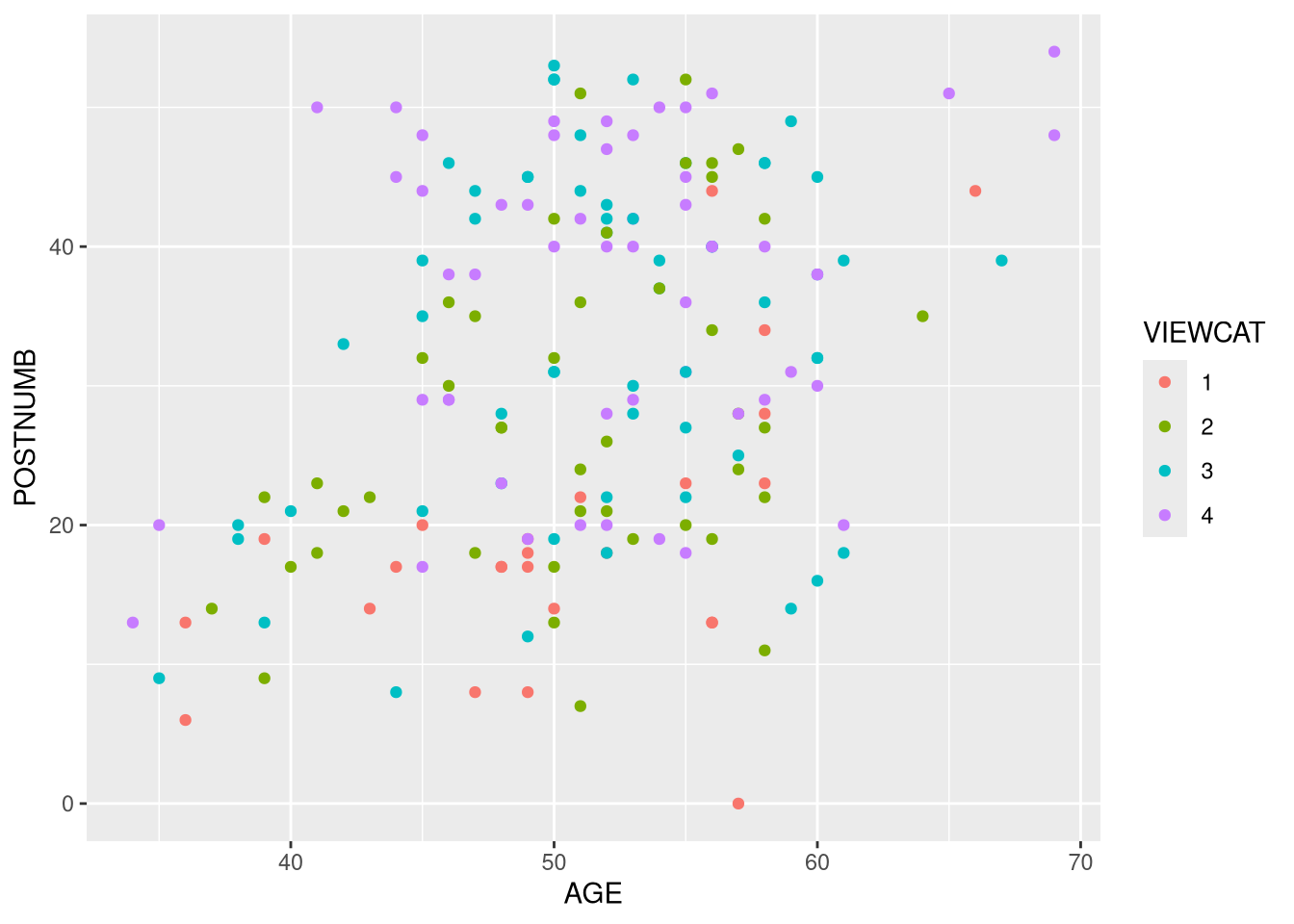 We assigned the global color aesthetic to the VIEWCAT variable, so the points are colored based on their group.