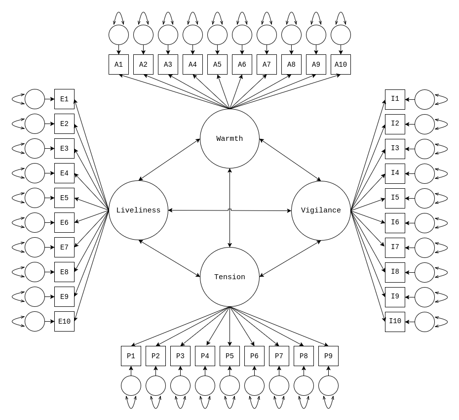 - The model forces independence between the latent constructs. So, M2 “tries” to estimate a Warmth factor that best conforms to a reality wherein Warmth, Liveliness, Vigilance, and Tension are completely unrelated concepts.